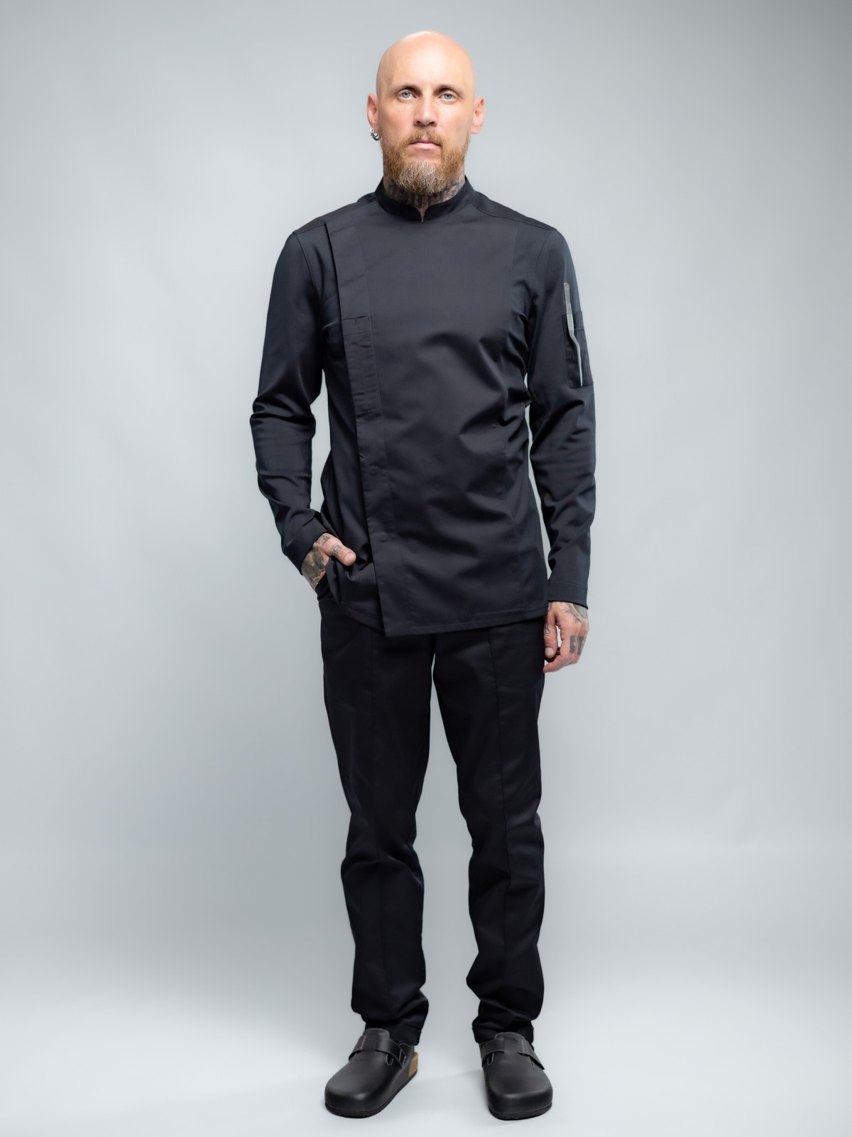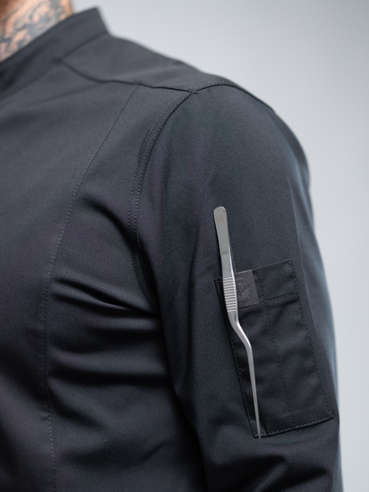 • Удобные потайные застежки-кнопки из нержавеющего металла надежно фиксируют поварской китель.