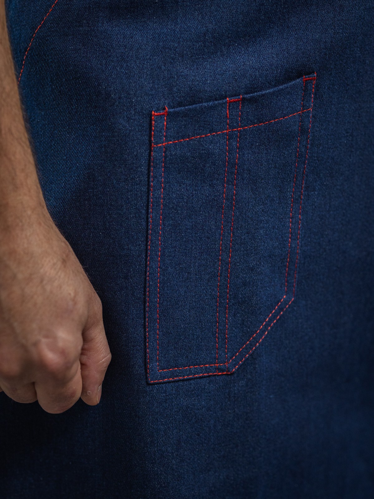 - Контрастные лямки и отстрочка акцентируют внимание на фартук.