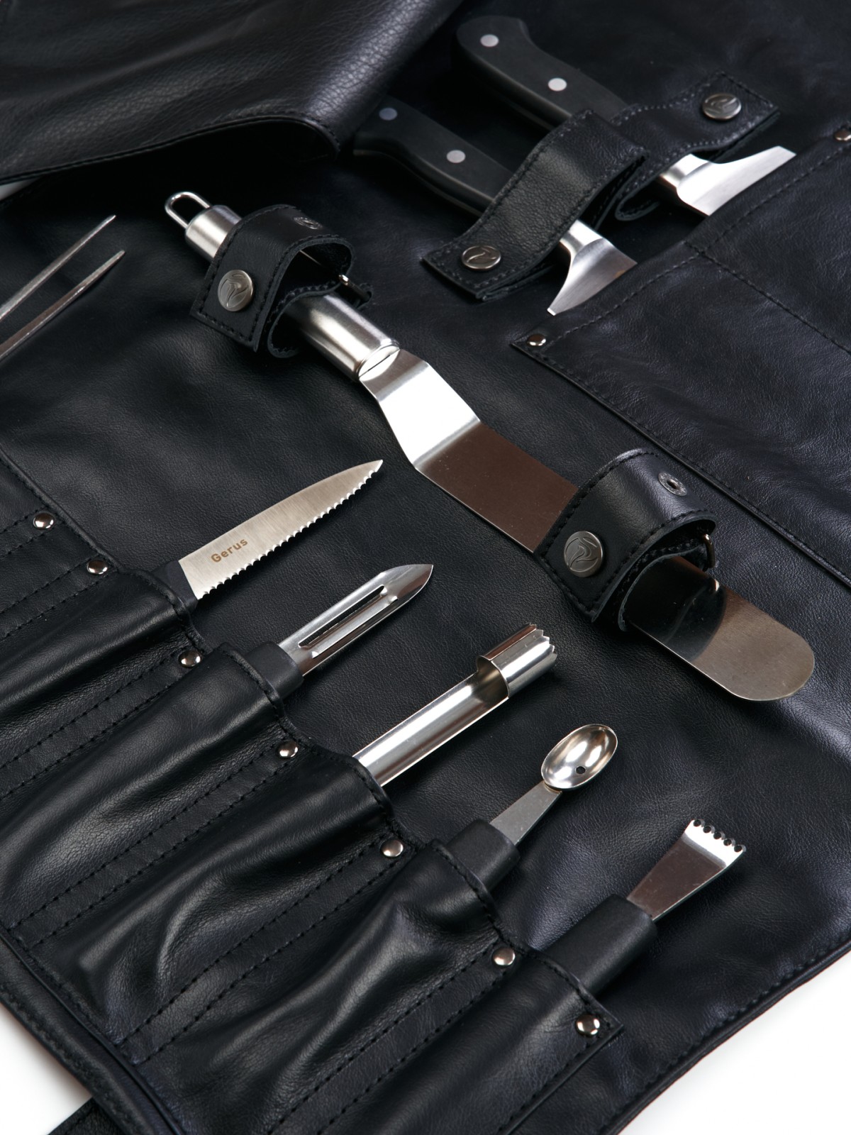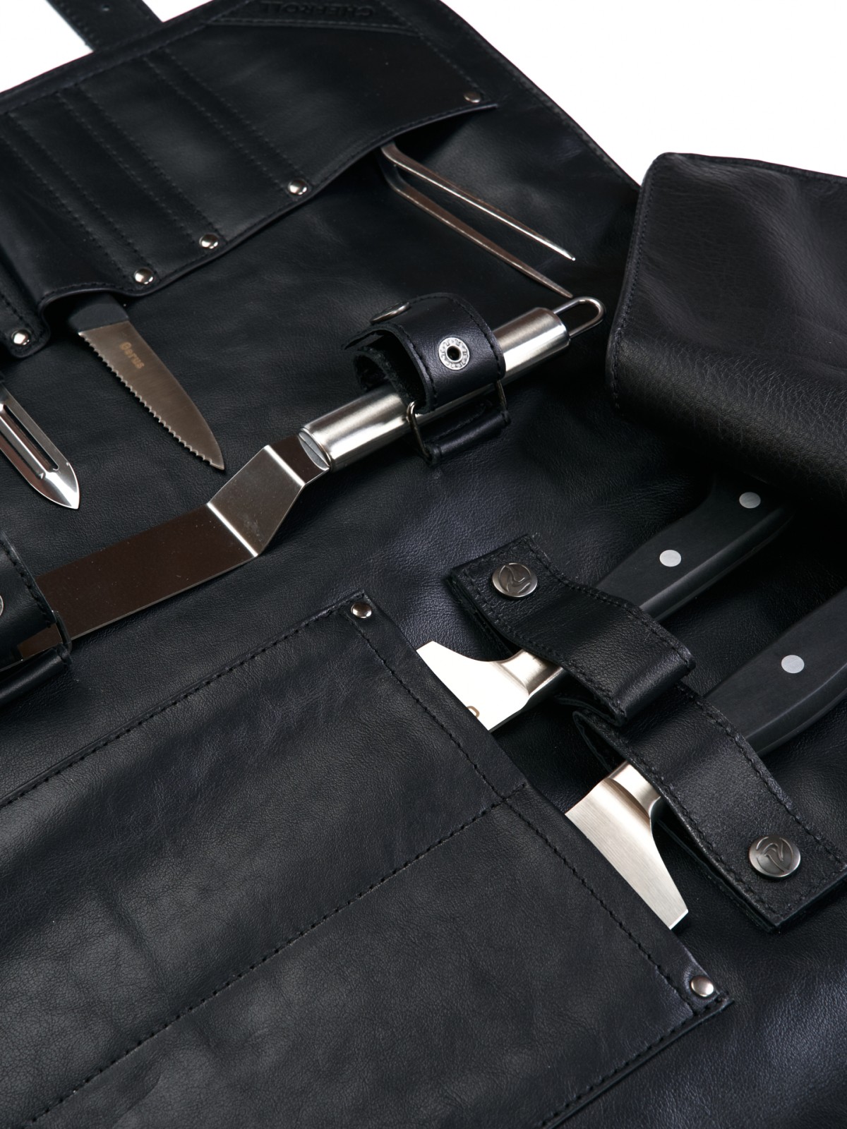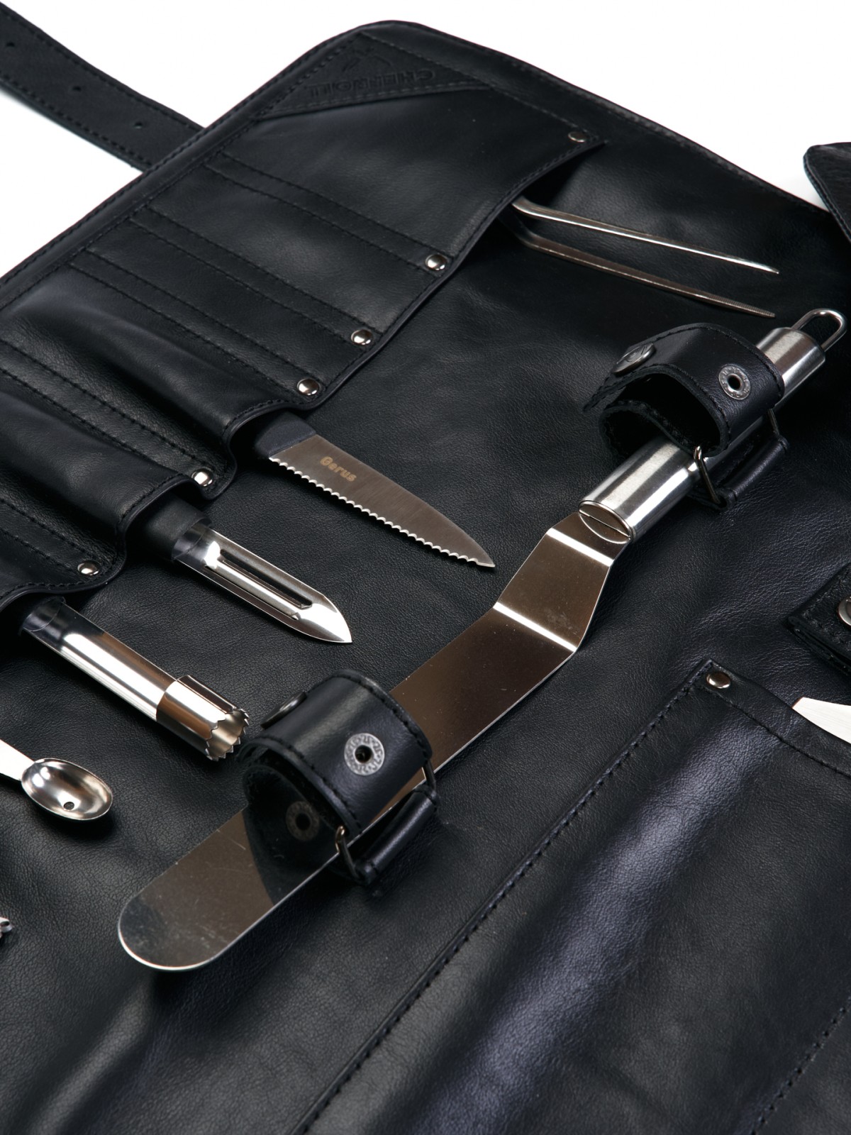 Вмещает в себя 2 ножа длиной до 25см. Имеет карманы для 7 инструментов, 2 крепления на кнопках для венчика или лопатки.