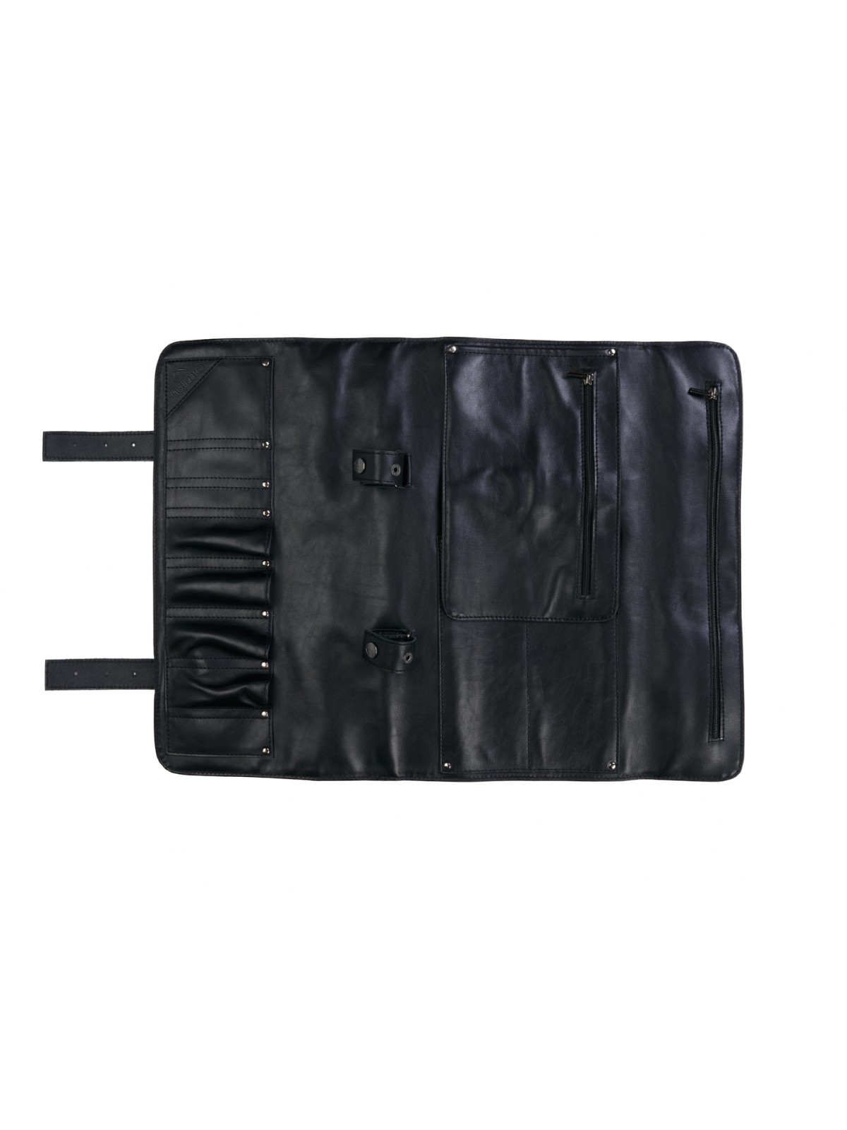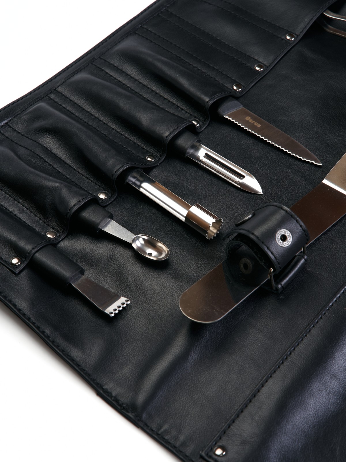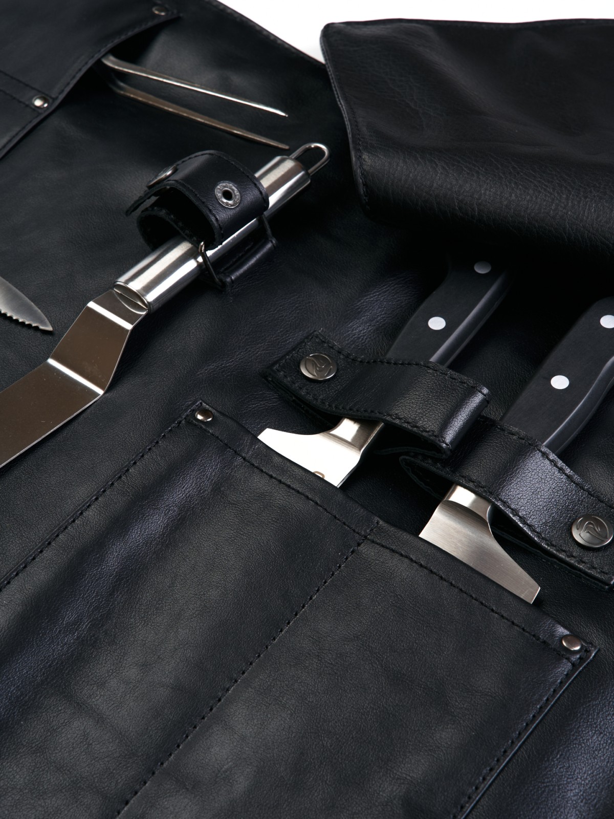 Вмещает в себя 2 ножа длиной до 25см. Имеет карманы для 7 инструментов, 2 крепления на кнопках для венчика или лопатки.