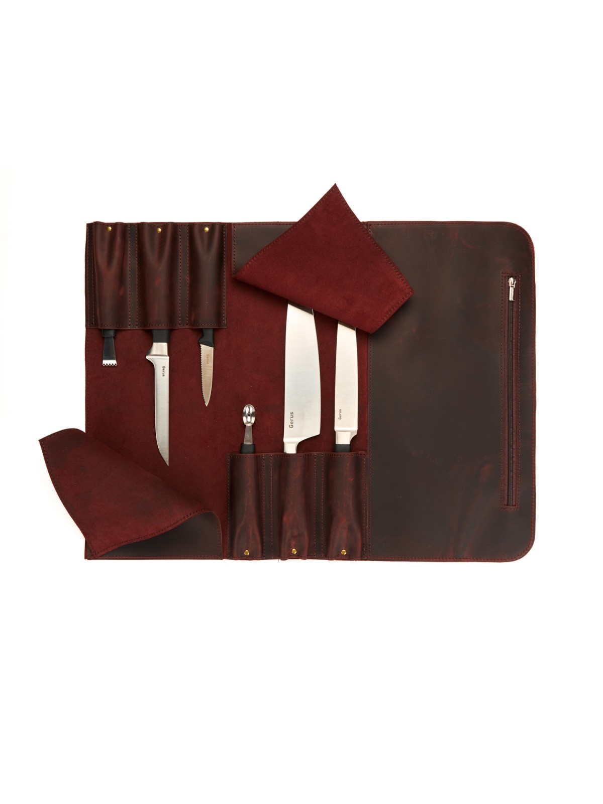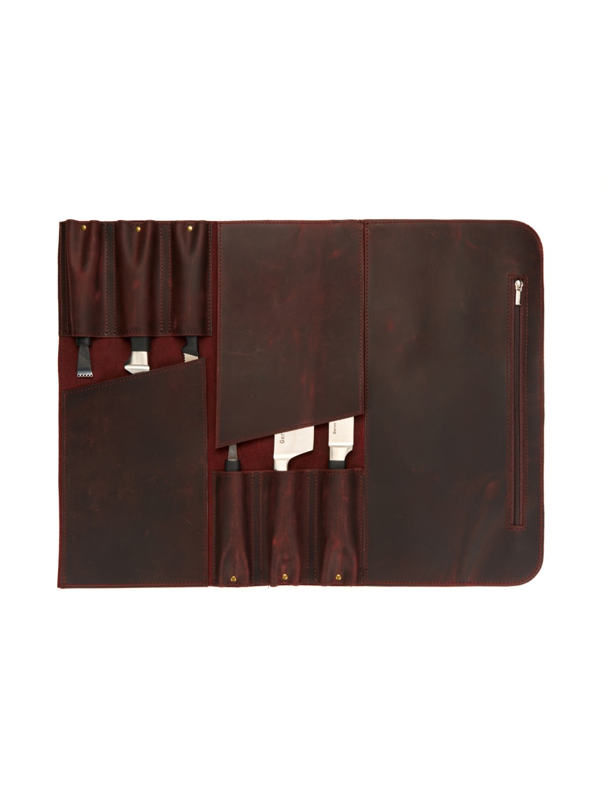 6 карманов для ножей и большой карман на молнии для остального инструмента.