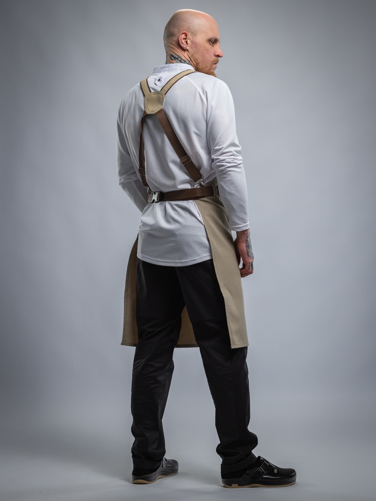 - Лямки фартука крестообразные. Они равномерно распределяют нагрузку на плечи, не нагружая шею.