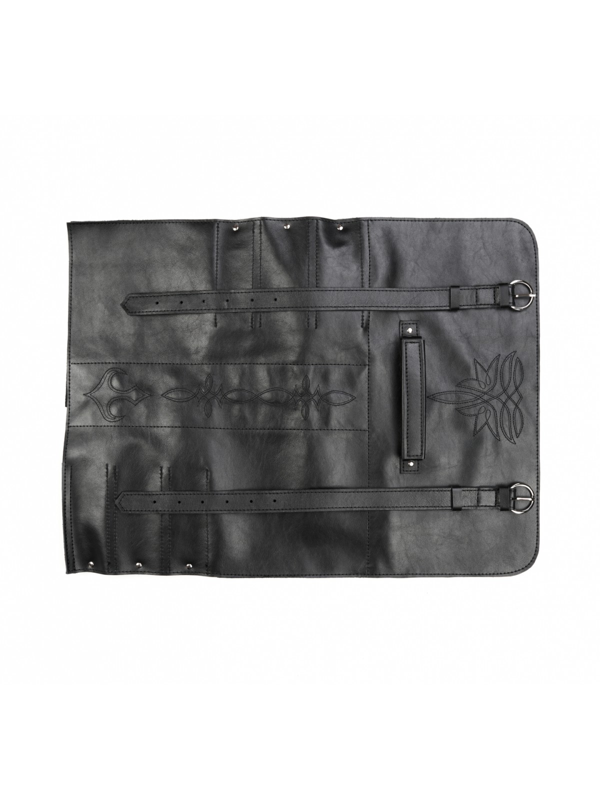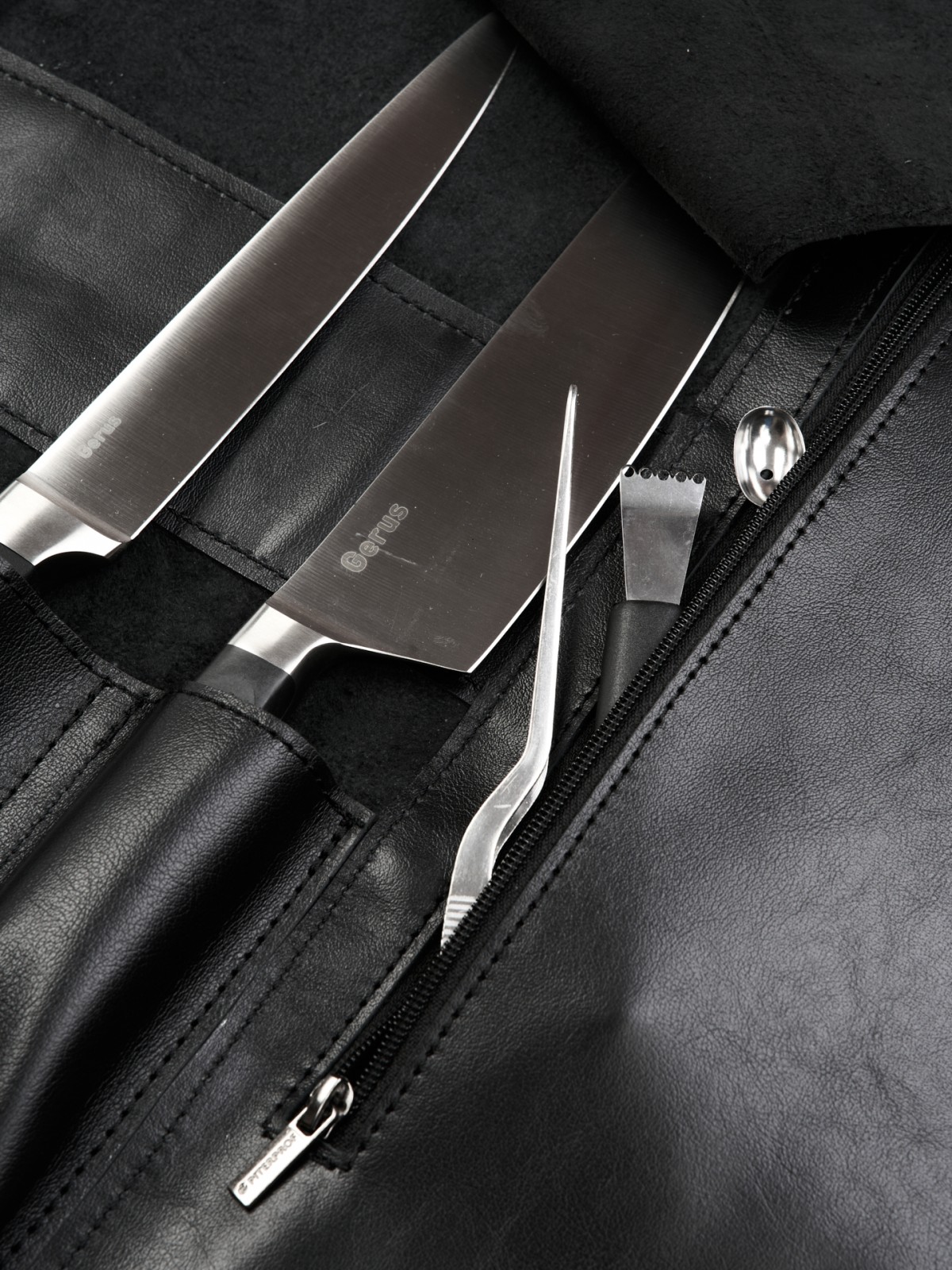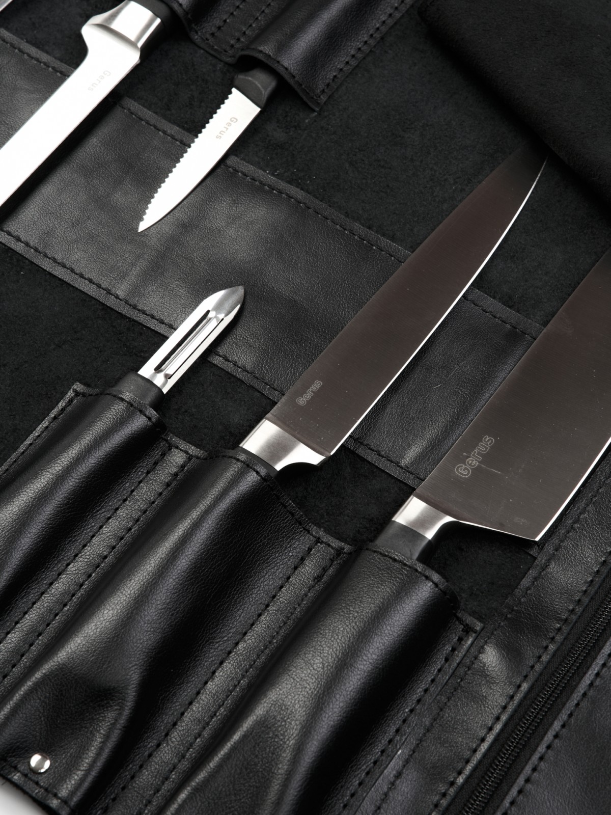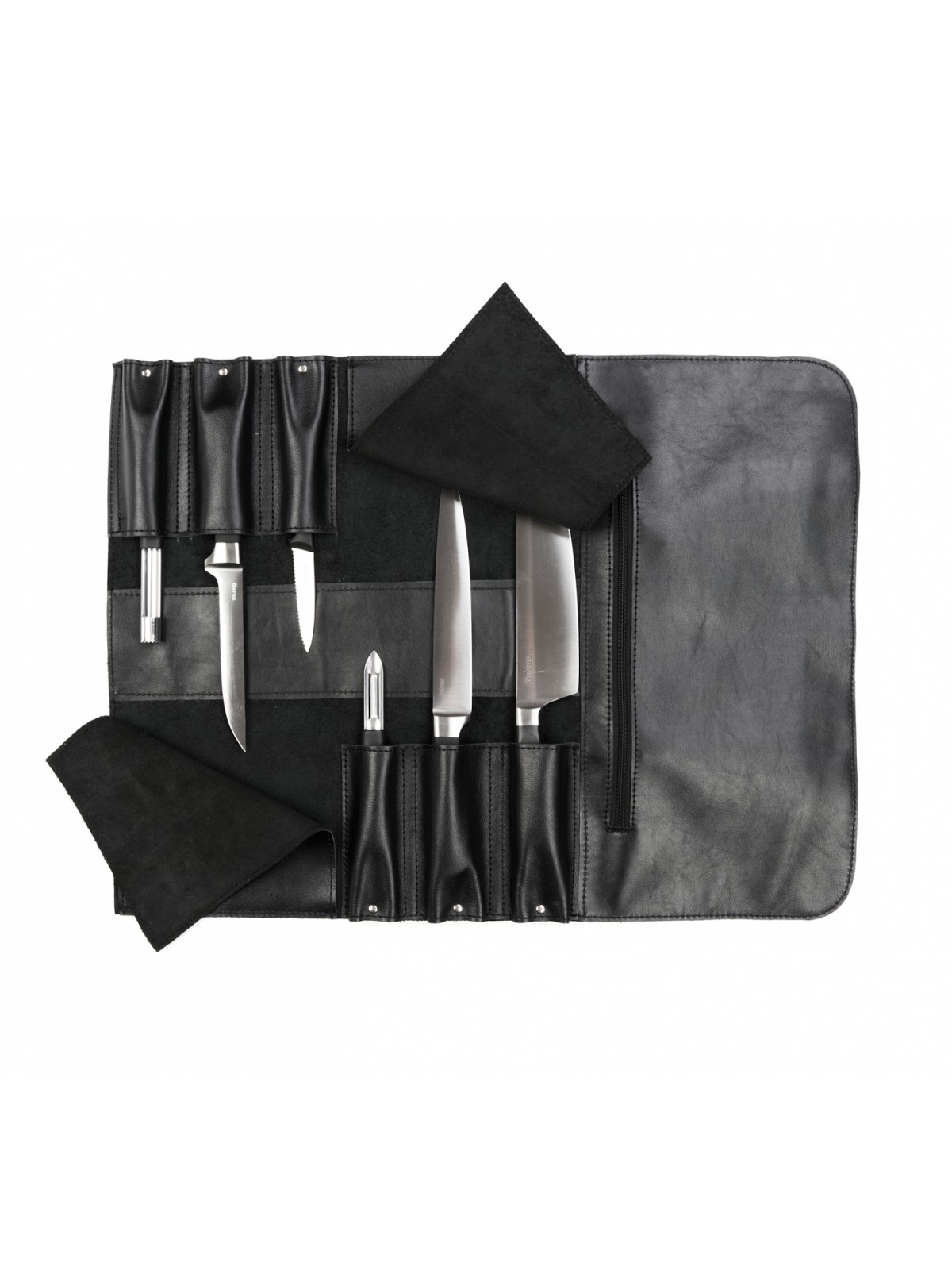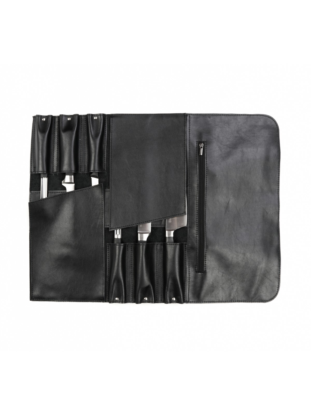 6 карманов для ножей и большой карман на молнии для остального инструмента.